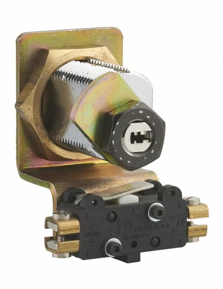 Contacteur à commande par clé. Corps laiton. Mécanisme à goupilles. Inverseur à 4 bornes. Minirupteur avec connexions vissées montage possible sur organigramme. 3 clés en acier nickelé.
