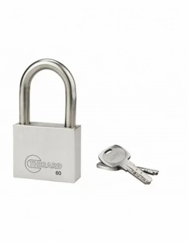 Corps inox. Anse inox. Mécanisme à goupilles. Double verrouillage par billes inox. Clé " prisonnère" : Le cadenas doit être fermé pour reprendre la clé. 2 clés plates réversibles laiton nickelé avec carte de propriété, permettant la reproduction des clés exclusivement en usine.