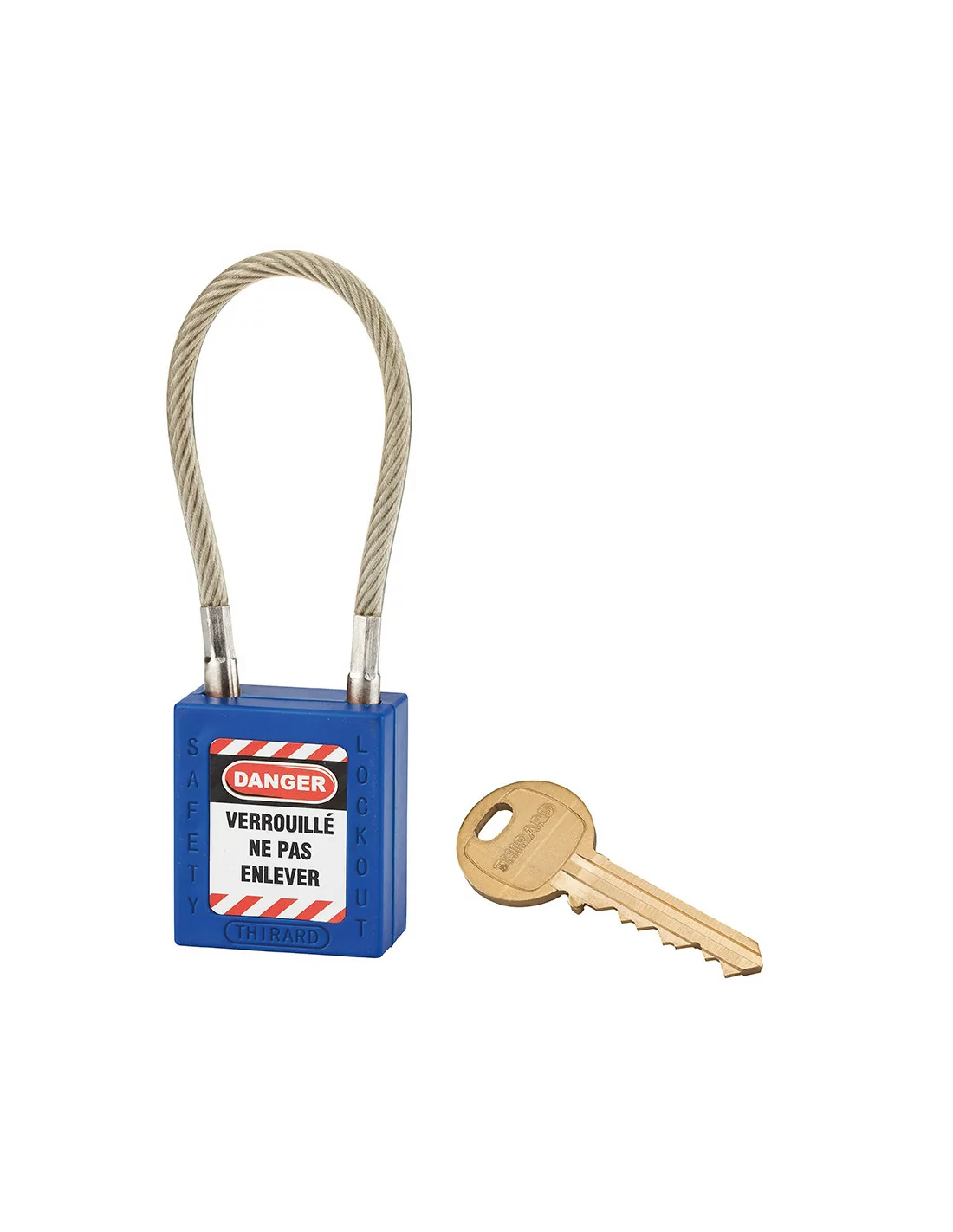 Cadenas de consignation LOTO Lockout Tagout 38 mm câble inox gainé Ø 6 x 1500mm - 1 clé bleu - THIRARD