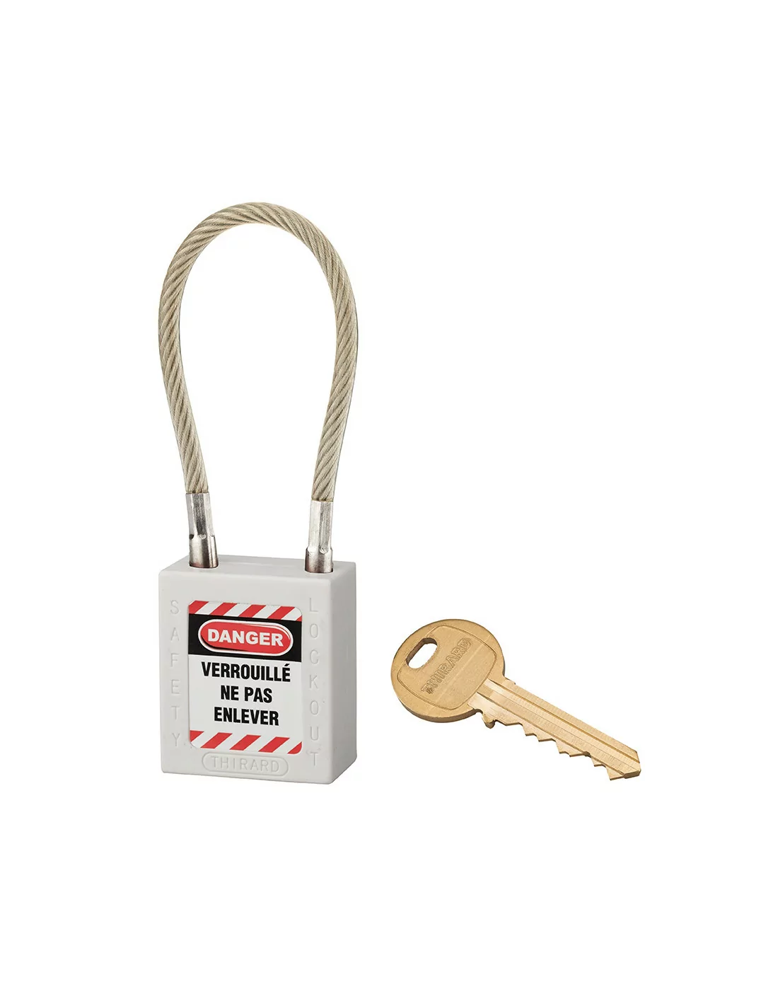Cadenas de consignation LOTO Lockout Tagout 38 mm câble inox gainé Ø 6 x 1500mm - 1 clé blanc - THIRARD