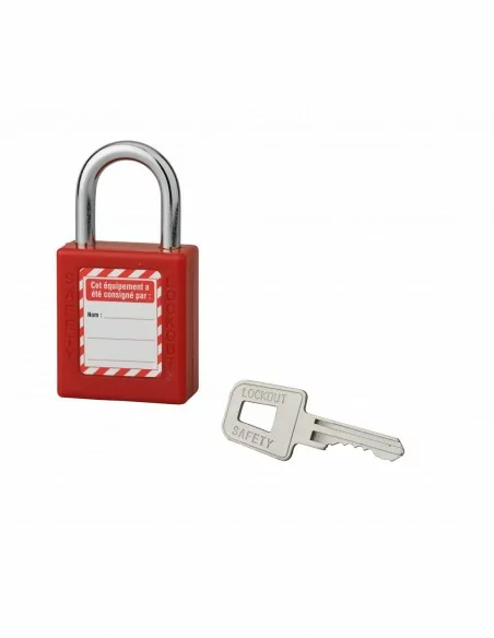 Spécialement conçu pour accroître la sécurité dans les industries, le cadenas de consignation informe visuellement des instructions à respecter concernant un appareil ou un outil. Doté d'un corps non conducteur, ce cadenas dispose d'un mécanisme à goupilles. Son système à double verrouillage offre un blocage de la clé en position ouverte pour diminuer les risques d'oubli. Garanti 10 ans, ce cadenas de consignation est résistant à la chaleur, aux chocs ainsi qu'à la corrosion. Il est disponible en plusieurs mesures et couleurs selon le besoin.