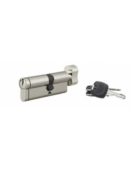 En stockProfil européen laiton. Mécanisme à 5 goupilles. Protection contre le perçage par 1ère goupille + poussoir en acier trempé. Protection contre l'effraction de la partie saillante du cylindre (anti-snap). Panneton anti arrachement. 3 clés plates avec carte de propriété permettant la reproduction des clés. exclusivement en usine. Pièce mobile anti-crochetage interne au cylindre interdisant toute reproduction hors usine. Option : Aiguille anti-perçage.