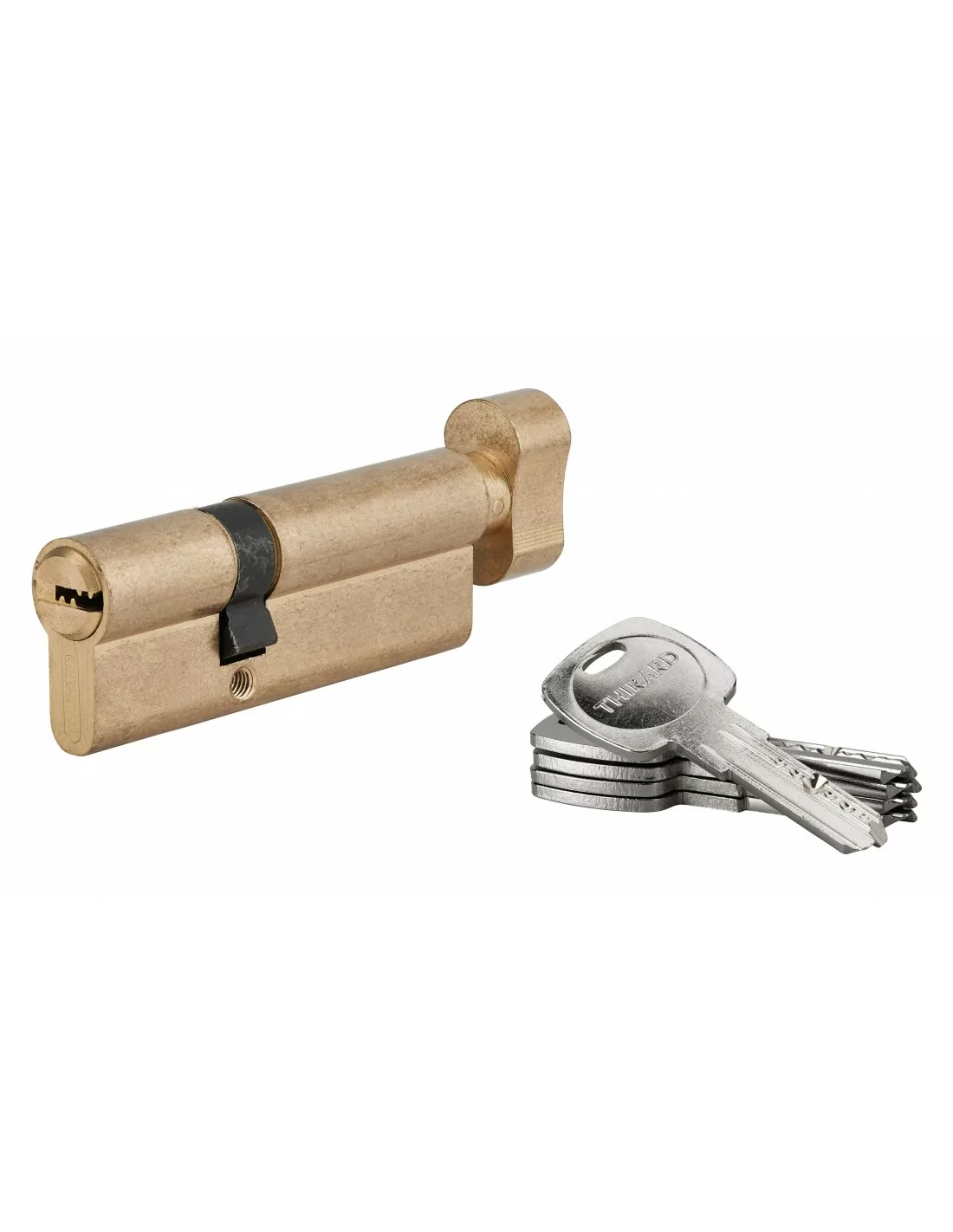 Profil européen laiton. Mécanisme à 6 goupilles. Protection contre le perçage par aiguille en acier trempé. Panneton anti arrachement. 5 clés plates réversibles acier nickelé.