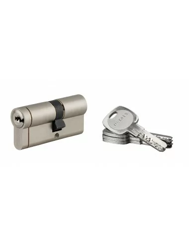 Profil européen laiton. Mécanisme à 6 goupilles protection contre le crochetage. Protection contre le perçage par 1ère goupille + poussoir en acier trempé. Protection contre l'effraction de la partie saillante du cylindre (anti-snap). Panneton anti arrachement. 4 clés plates réversibles laiton nickelé avec carte personnelle.