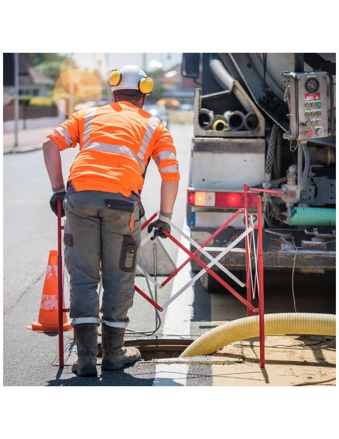 La barrière de regard 'trou d’homme' vous sera utile pour tous vos travaux de voirie, vos interventions sur des réseaux de canalisations. Elle permet de sécuriser une petite zone (jusqu’à 1,5 m²) et ainsi prévenir de la chute d’un piéton dans une bouche d’égout ouverte. Ses couleurs rouge et blanche très contrastées et visibles sont adaptées pour les petites zones dangereuses à sécuriser comme : -Travaux d’égout -Remplacement d’un tampon de regardElle ne prend que très peu de place en position pliée, son transport n’en sera que plus facile. Grâce à son installation simple et rapide, vous pouvez la mettre en place tout seul, ce qui sera un gain de temps pour vos interventions extérieures de maintenance ou de travaux. Ses 4 pieds permettent un balisage à 360°.