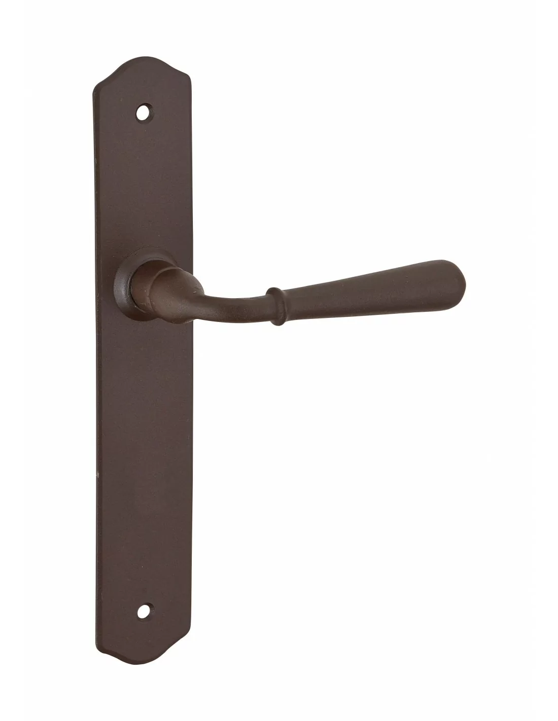 Plaques aluminium fondu. Béquilles aluminium fondu. Carré acier 8 mm. Vis métaux. Pour porte épaisseur 50 mm maxi. Entr'axe de fixation 195mm.