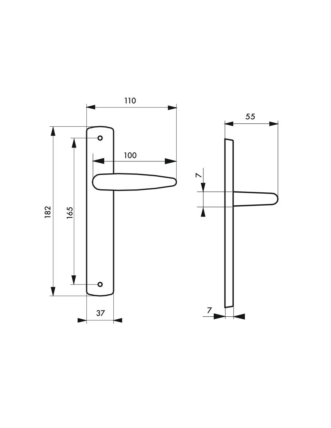 Plaques aluminium fondu. Béquilles aluminium fondu. carré acier 7 mm. Vis métaux. Pour porte épaisseur 45 mm maxi. Entr'axe de fixation 195 mm.