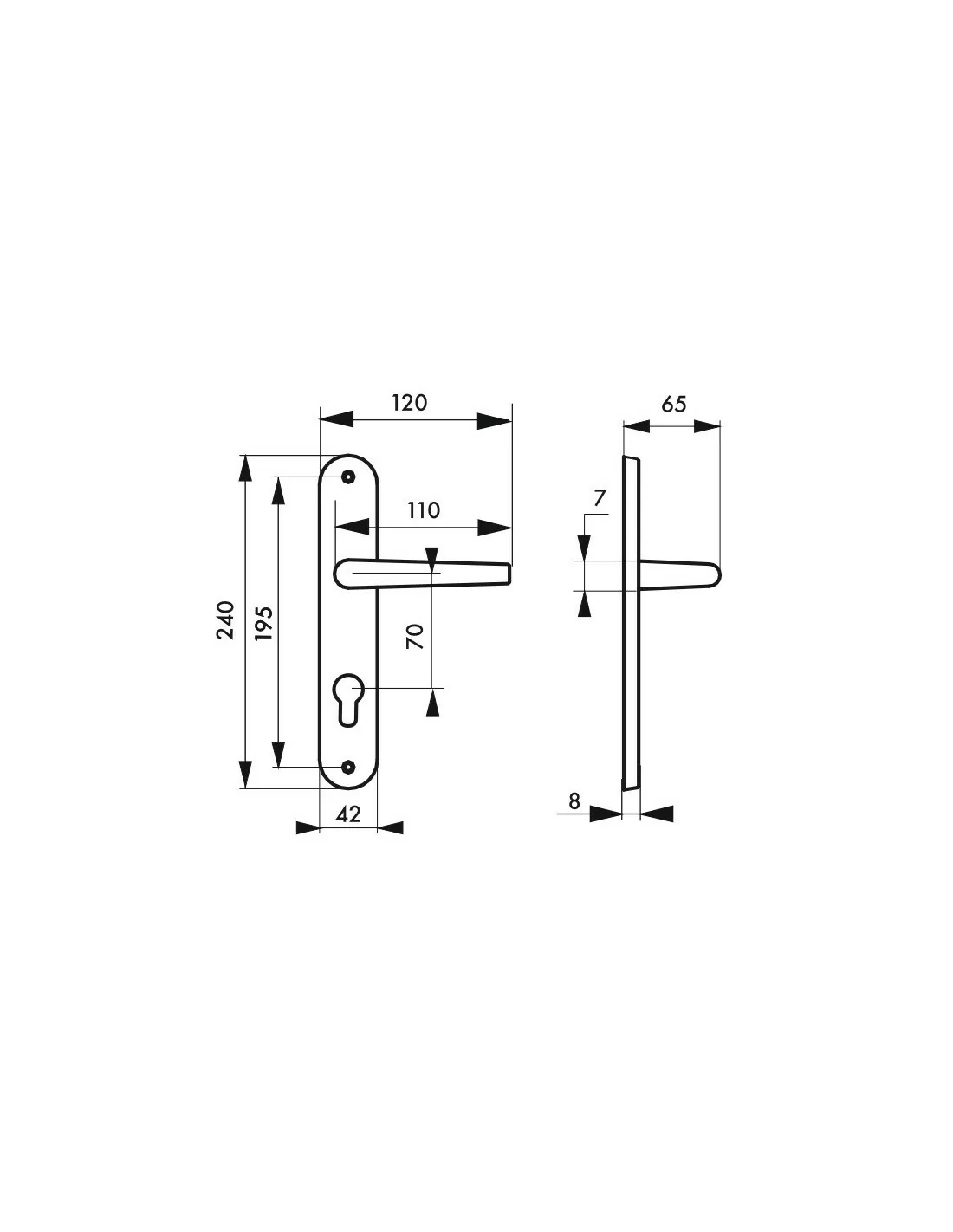 Plaques acier embouti. Béquilles alliage fondu. carré acier 7 mm. Ressort de rappel. Vis métaux sécables. Entr'axe de fixation 195 mm.