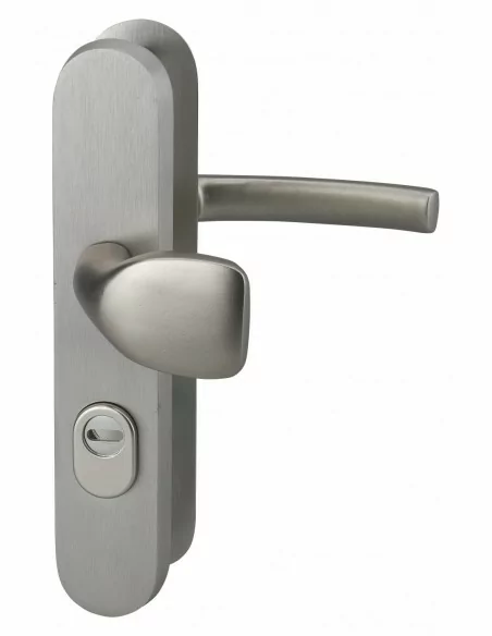 Plaques aluminium fondu. Béquilles aluminium fondu. Carré acier 7 mm. Vis métaux. Pour porte épaisseur 50 mm maxi. Entr'axe de fixation 195mm.