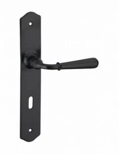 Plaques acier embouti. Béquilles alliage fondu. carré acier 7 mm. Ressort de rappel. Vis métaux sécables. Entr'axe de fixation 195 mm.