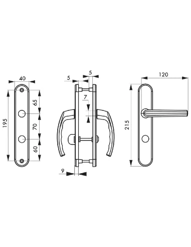 Plaques aluminium embouti. Béquilles aluminium fondu. carré acier 7 mm ou 8 mm. Vis métaux à douille. Pour porte épaisseur 45 mm maxi. Entr'axe de fixation 195 mm.