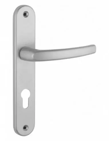 Plaques aluminium embouti. Béquilles aluminium fondu. carré acier 7 mm ou 8 mm. Vis métaux à douille. Pour porte épaisseur 45 mm maxi. Entr'axe de fixation 195 mm.