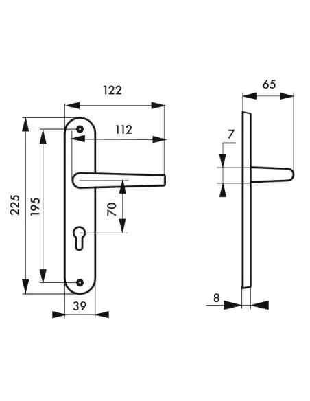 Plaques acier embouti. Béquilles alliage fondu. carré acier 7 mm. Ressort de rappel. Vis métaux sécables. Entr'axe de fixation 195 mm.