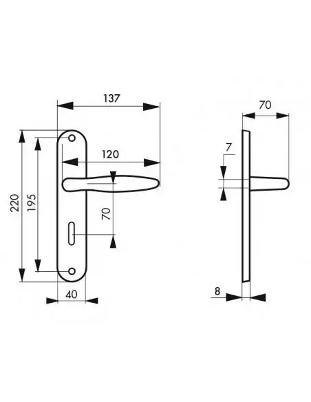 Plaques aluminium fondu. Béquilles aluminium fondu. carré acier 7 mm. Vis métaux. Pour porte épaisseur 45 mm maxi. Entr'axe de fixation 195 mm.