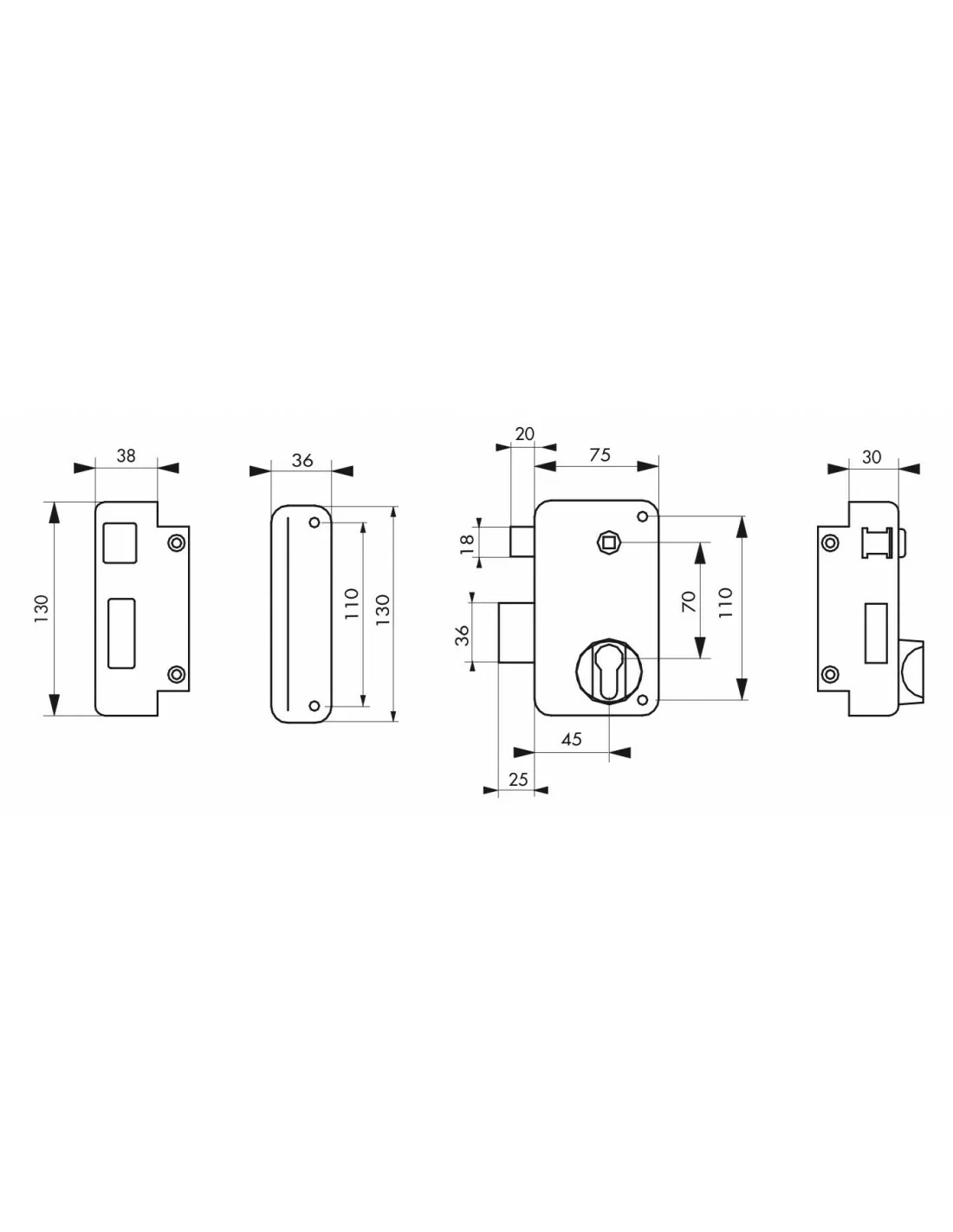 Coffre et gâche acier embouti. Pêne et demi-tour acier en saillie de 5 mm. Mécanisme à 2 tours. Rappel du demi-tour par la clé. Carré 7 mm. Entrée de cylindre et de fouillot laiton.