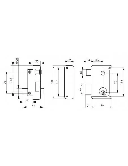 Coffre et gâche acier embouti. Pêne laiton, demi-tour laiton. Mécanisme à 3 tours. Rappel du demi-tour par la clé. Double cylindre laiton 5 goupilles long. 45 mm. Carré6mm. Entrée de cylindre et de fouillot acier. 3 clés laiton nickelé.