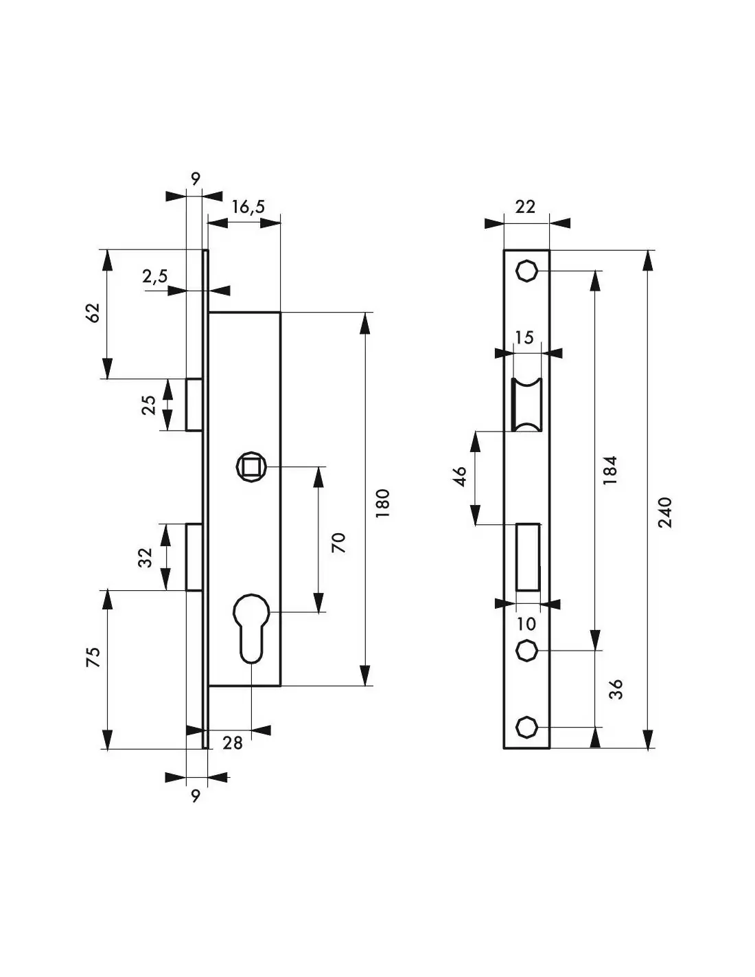 Serrure encastrable pour porte d'entrée panneton réduit axe 16,5 l 28mm e70 réversible