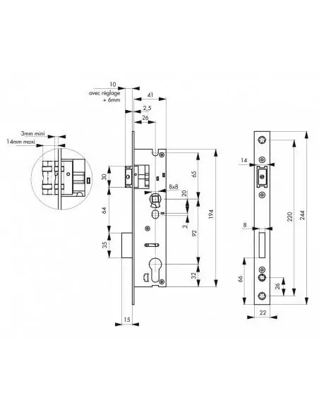 Coffre acier zingué plastifié. Têtère acier nickelé chromé largeur 22mm. Demi-tour alliage nickelé réversible. Interchangeable avec pène à rouleau. Carré 8 mm, entr'axe 67 mm.