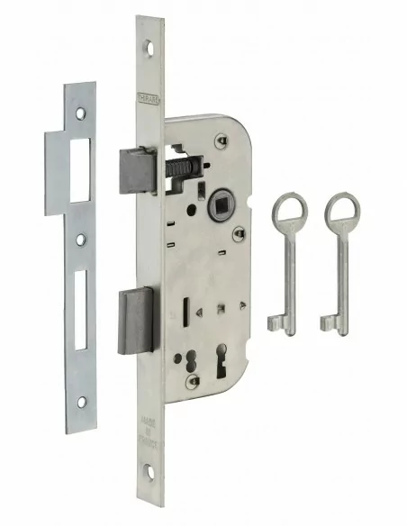 Encastrable dans l’épaisseur de la porte, ce coffre de serrure est fabriqué en acier. Particulièrement conçue pour les portes intérieures, cette serrure à clé est appréciée pour sa discrétion et son rendu épuré. Son demi-tour est réversible sans nécessiter le démontage du coffre, rendant son utilisation possible pour une ouverture à gauche comme à droite. Dotée d’un mécanisme à un ou deux tours et d’un entr’axe à 70mm, elle se compose d’une têtière à bouts ronds ou carrés selon le modèle choisi. Cette serrure encastrable est fournie avec une ou deux clés et une gâche plate en acier. Elle vous est proposée en finition époxy blanc ou zinguée.