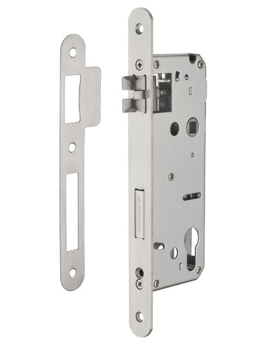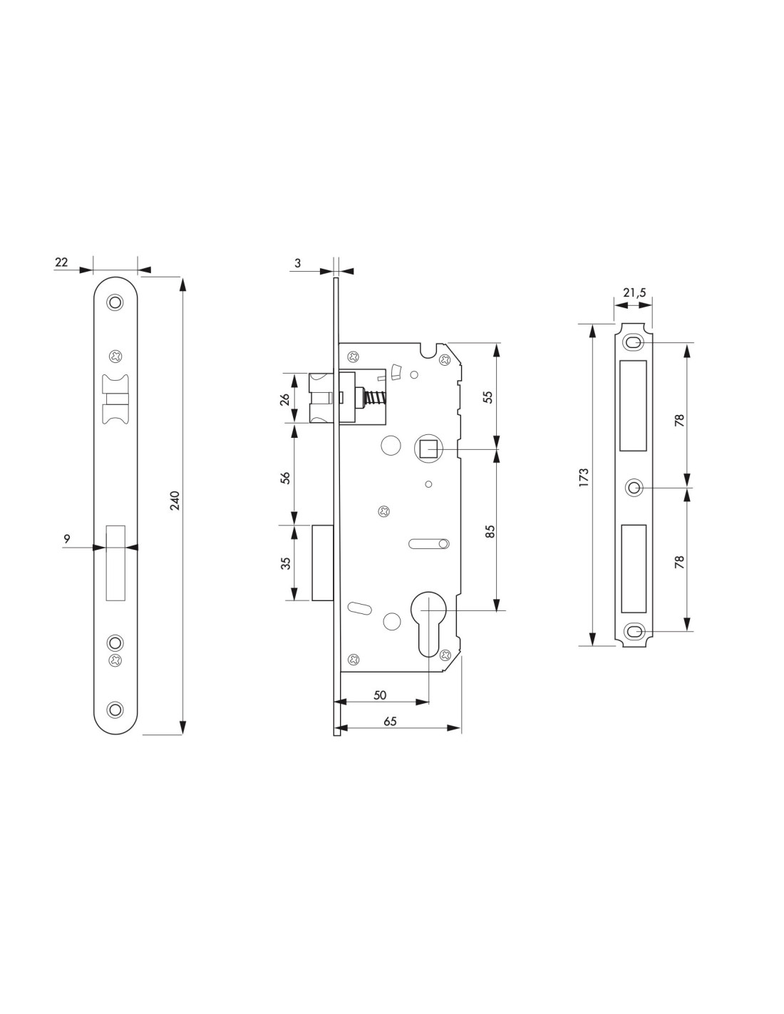 Coffre acier embouti. Têtère acier bouts ronds. Demi-tour bipente alliage réversible sans démontage du coffre. Pêne acier galvanisé. Gâche plate acier zingué. Carré 7 mm, entr'axe 70 mm.