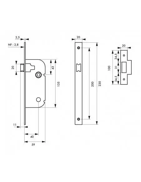 Coffre acier embouti. Têtère acier. Pêne acier. gâche plate acier. Mécanisme à 1 tour. 1 clé. 6 variures.