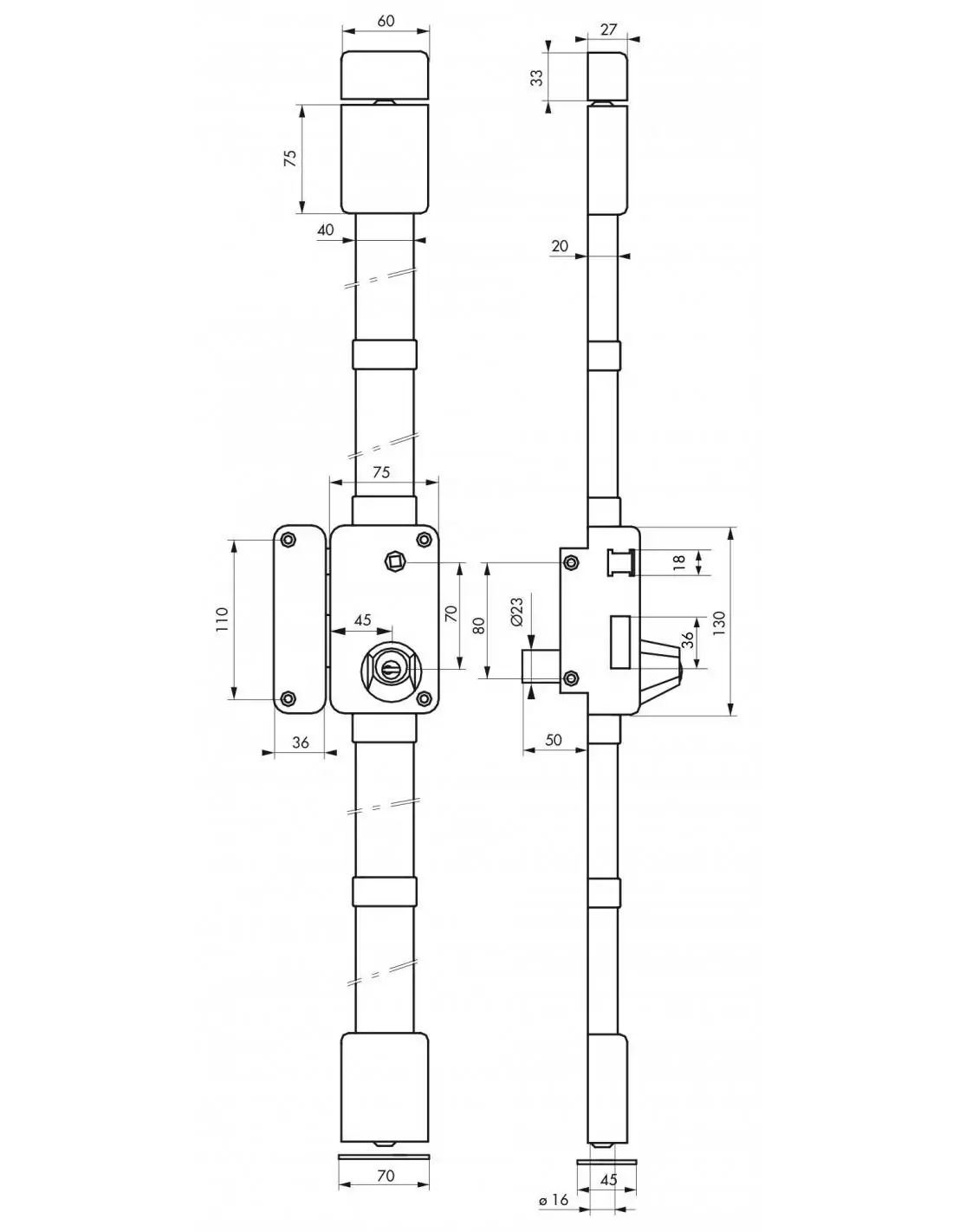 Boîtier en acier embouti épaisseur 20/10ème. Coffre de 75x130mm, axe à 45 mm. Tringles standard permettant une condamnation de porte de 1,65 m à 2,25 m. Mécanisme intérieur type équerre permettant la manoeuvre du 1/2 tour avec la clé, de l'intérieur comme de l'extérieur. Pêne dormant et 1/2 tour en laiton massif. Pênes haut et bas en acier ภ16 mm sur tringles plates en acier permettant un ajustement très précis à la longueur désirée et ne nécessitant aucune recoupe. gâche équerre de haute résistance. Cache-tringles, guides et gâches de pênes haut et bas en acier ne laissant apparaître aucune vis de fixation. Carré7mm - Poignée double fournie pour serrure à fouillot. Le montage de la serrure ne nécessite pas d'entaillage spécifique de la porte. Cylindre rond HG5Double cylindre laiton à 23 mm, longueur 60 mm. Mécanisme à 5 goupilles. 4 clés en acier nickelé. Cylindre rond Transit 2Double cylindre laiton à 23 mm, longueur 60 mm. Mécanisme à 8 goupilles protégé contre le crochetage. Protection contre le perçage par 1ère goupille + poussoir en acier trempé. 4 clés plates réversibles en laiton nickelé avec carte de propriété. Options : Jeu de tringles grande hauteur permettant un verrouillage jusqu'à 3,00?m. Poignée de tirage extérieure - Poignée simple DEAUVILLE laqué blanc ou marron - Protège-gonds. Kit gâche pour huisserie métallique, pour porte à recouvrement.