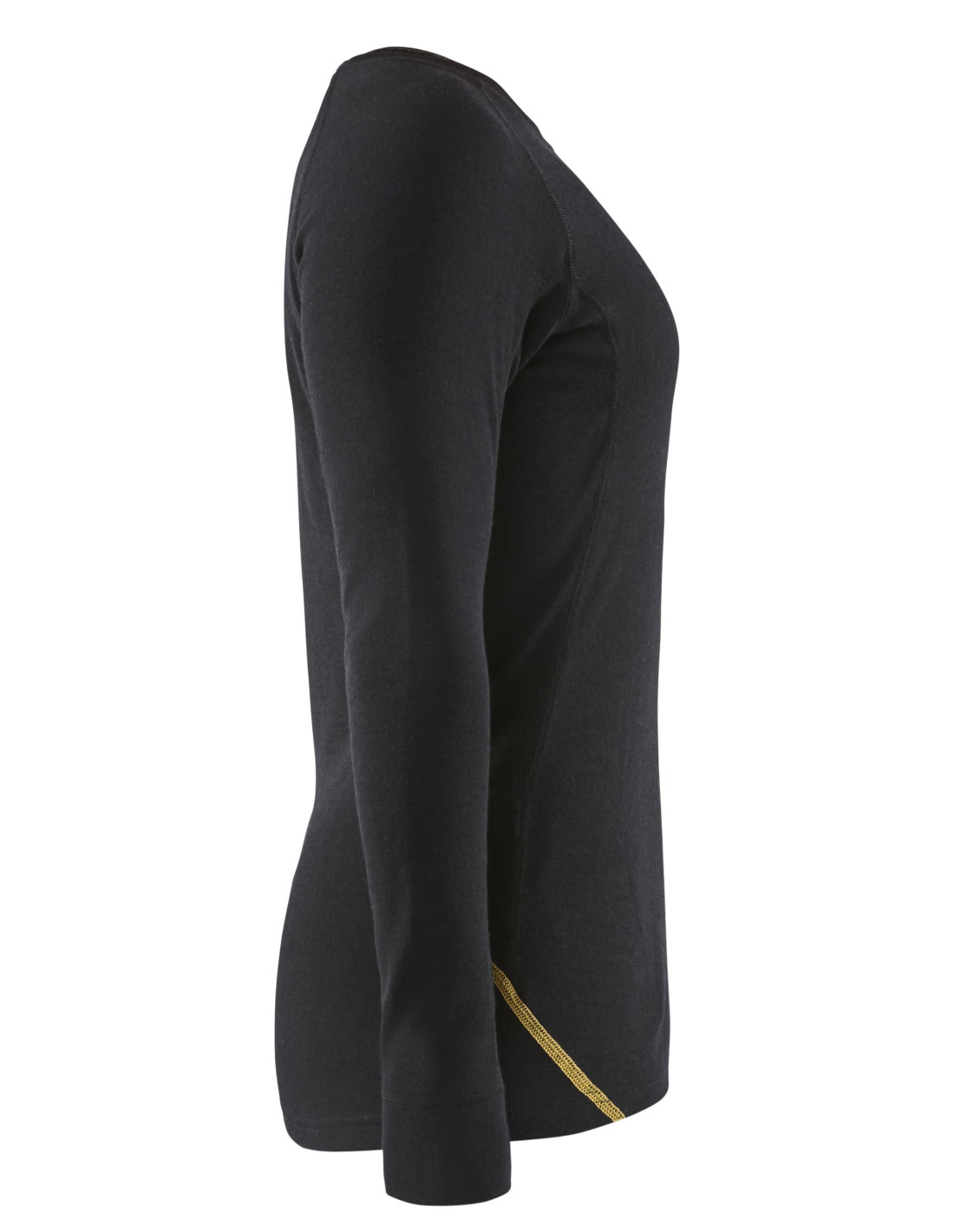 Haut de sous-vêtement thermique retardant flamme, coupe féminine, en laine mérinos (78%) de haute qualité. La meilleure qualité en termes de matériaux et de garantie de fabrication. En plus de sa coupe ergonomique et de ses propriétés protectrices, ce haut de sous-vêtement thermale possède la capacité unique de conserver la chaleur dans des conditions humides et sèches. Il est idéal pour les environnements intérieurs comme extérieurs. A laver en délicat à 60ºC. Certifié selon les standards EN 1149-5. EN ISO 11612 A1, B1, C1. IEC 61482-2, Classe 1. EBT 7.3 cal/cm², HAF: 78.6%. 78% laine, 20% modacrylique, 2% antistatique, mérinos, ignifuge, antistatique, 225 g/m² - Noir. Multinormes. Femme. XS-XXXL.